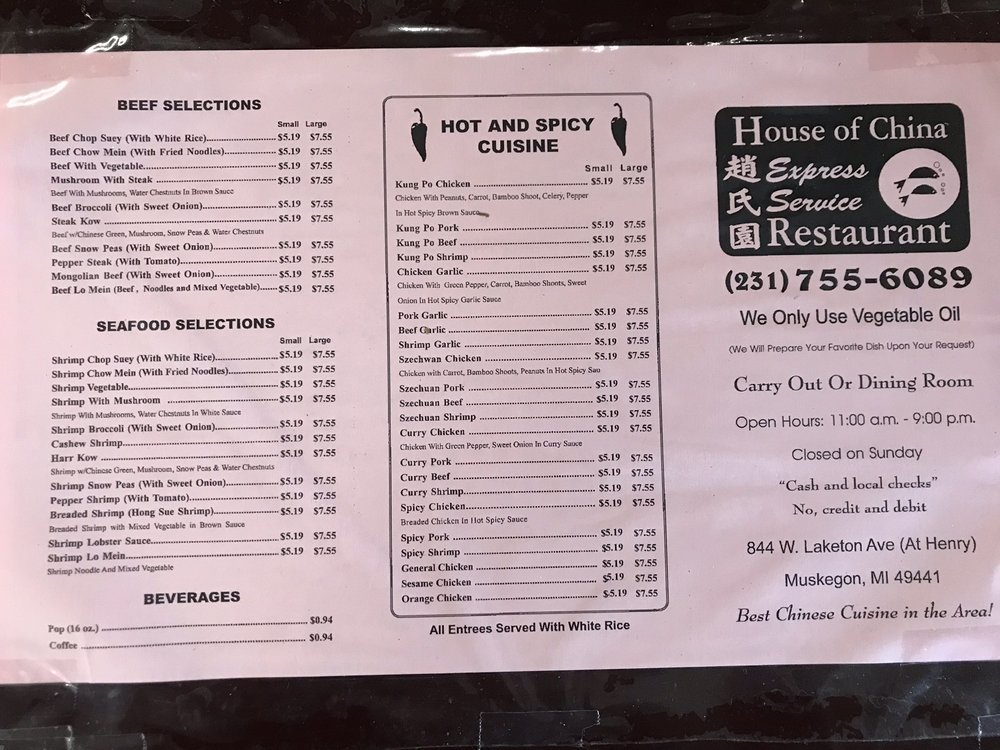 House Of China, located in Muskegon, MI, is a renowned Chinese restaurant that boasts a diverse menu filled with flavorful dishes. The restaurant offers takeout, delivery, and caters to both vegetarians and meat lovers alike. Customers rave about dishes like the Spicy Chicken, Crab Rangoons, and Sweet and Sour Chicken, all made with fresh ingredients and generous portions. The ambiance at House Of China is unique, with hand-crafted decorations and a whimsical interior that adds to the overall dining experience. The service is personal and accommodating, although the restaurant only accepts cash payments. If you're looking for authentic Chinese cuisine that stands out from the rest, look no further than House Of China.